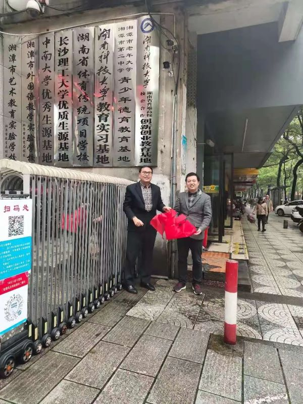 在二中门口,聂志军教授与唐新球校长代表双方喜揭红绸,共同完成揭牌仪式,湘潭市二中正式成为“ML米兰体育·(国际)官方网站大学生创新创业基地”。这是一次我院与二中融通融合,创新发展的良好契机,将开启双方友好往来、通力合作的新篇章。