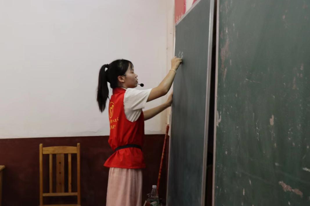 ▲志愿者在黑板上抄写歌词
