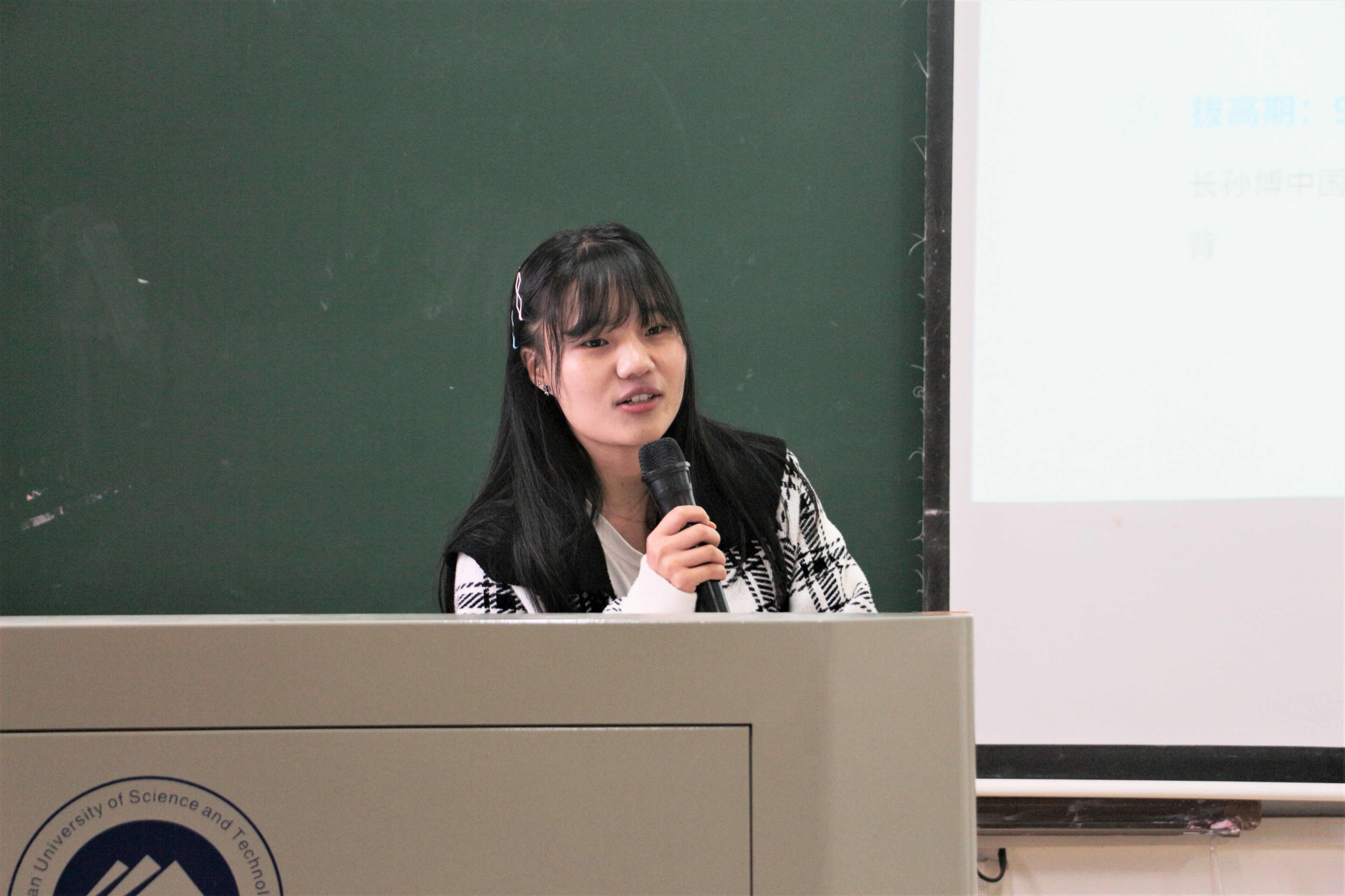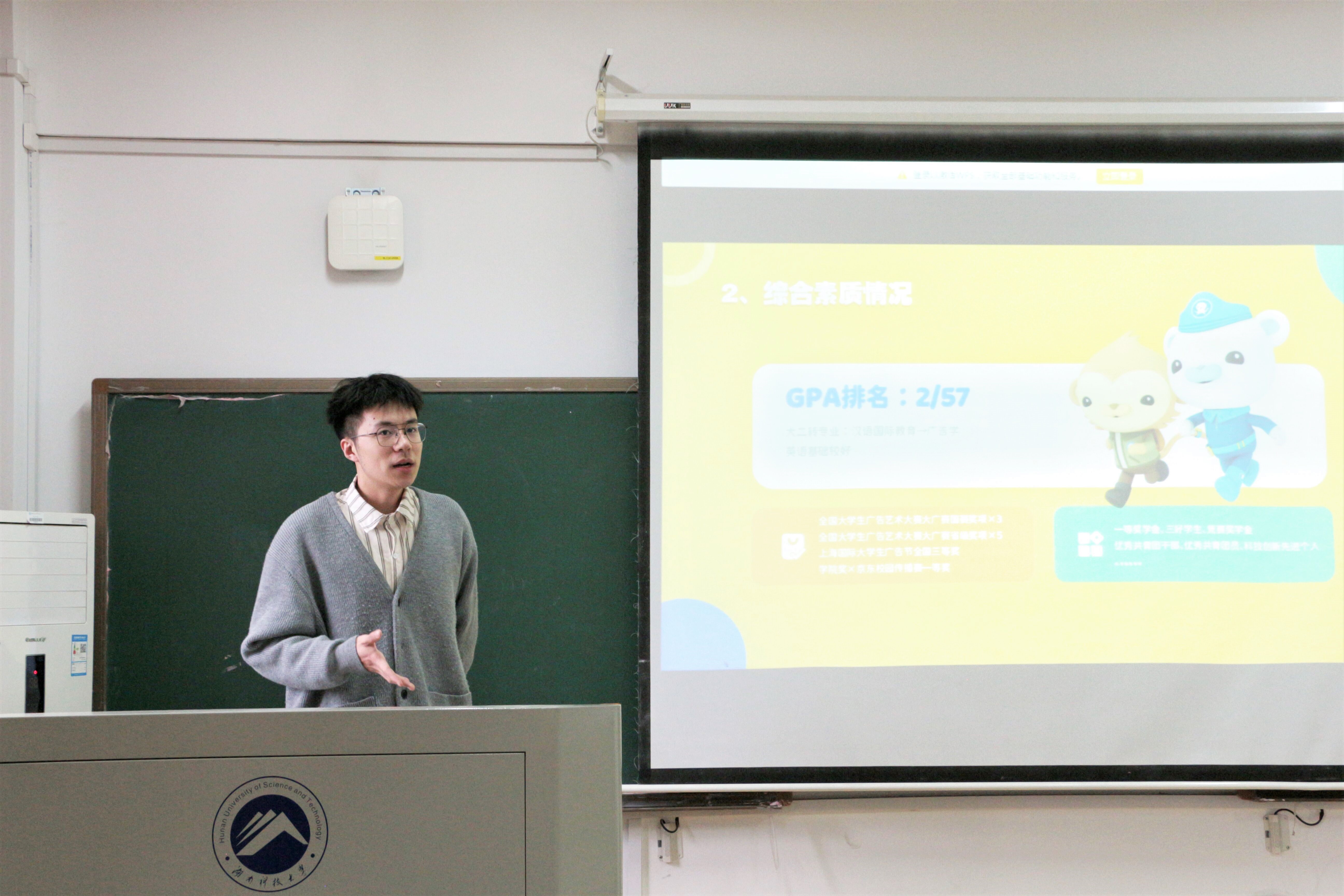 随后,已被相关学校录取为研究生的优秀学生代表依次就学习与生活两方面分享自己的经验与感悟。被中南大学录取的19级广告学一班的李赞在分享自己的英语学习方法和备考经验时指出:“要跳出自己的舒适圈,去剖析自己”;被华中师范大学录取的19级历史一班吴有飞总结出坚持就是胜利,在学习中要做好选择、劳逸结合的经验;被上海师范大学录取的19级汉语言文学专业的李世浩则表示备考要打好基础,考研需坚持;被南京师范大学19级历史一班的卢东玥则从院校选择、备考经验等方面进行分享,重点强调在备考过程中,要做好时间规划,查漏补缺,调整好心态。
