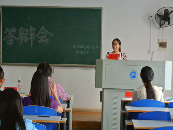 答辩现场,各2011级毕业生从选题、论文内容、成文思路、创新点等方面对自己的论文概述,台下的评委认真细致批评指正论文不足之处。