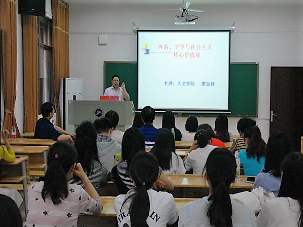 本次专家讲座分为两场,分别邀请ML米兰体育·(国际)官方网站党委书记廖加林教授和我校社科处副处长、ML米兰体育·(国际)官方网站李胜清教授作主题讲座。廖加林教授的讲座主题是《自由、平等与社会主义核心价值观》,廖教授在讲座中从“核心价值观”的定义谈起,从哲学社会科学的角度全面分析了社会主义核心价值观。他借用苏格拉底的名言“未经省察的人生是没有价值的”,鼓励、引导同学们要重视个人的三观,努力发掘自己在个人、社会、国家等三个层次的价值。