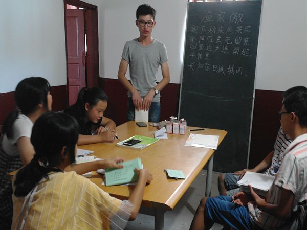 四、五年级的课堂上,孩子们正在学习分数除法,他们把老师布置的题目誊抄在作业本上,字迹整洁而工整。计算时,他们轻声地念叨着题目,聚精会神地埋头作答。“老师,我写好了,给你看!”迅速做好的孩子们高高地举起右手,左手则将作业本递到老师面前,满脸期待地望着老师,获得肯定后,又接着做下一题,眼神里流露出自豪与满足。“‘长河落日孤城闭’这句勾勒出一派壮阔苍茫的边塞黄昏景致,夕阳西下,绵延千里的戈壁,无边无际的大漠,一座孤城镶嵌其中。”在赏析范仲淹作品《渔家傲》时,志愿者李煜向初三班的孩子描述出一幅别致的画面。他用理解与记忆相结合的方式,要求孩子们准确默写诗词。