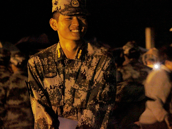 本次慰问演出中,最令人难忘的莫过于各排教官的上场。既是一连连长又是学生会副主席的尹俊一上台就引来了全场欢呼,“吴教!”“陈教!”,其他教官也在大家的呼唤中相继上场。现场音响设备临时出现了问题,教官们便肩并肩共同清唱。“本来说好用笑容为我送行,终于这一天我也踏上了归程。”这时,全场安静,倾听着教官们深情而质朴的歌唱。在教官们合唱歌曲《十年》时,更是引来了全场合唱。“两年前,也是这套军装,一年前,也是这套军装,”已经大三的尹教回忆着自己三年军训与带训的时光,“也许带完你们,这套衣服就脱下了,但是带过你们的点点滴滴,希望你们都不要忘记。”离别在即,尹教的话语令教官与新生们不无感伤,许多助班和新生纷纷上场拥抱自己的教官。