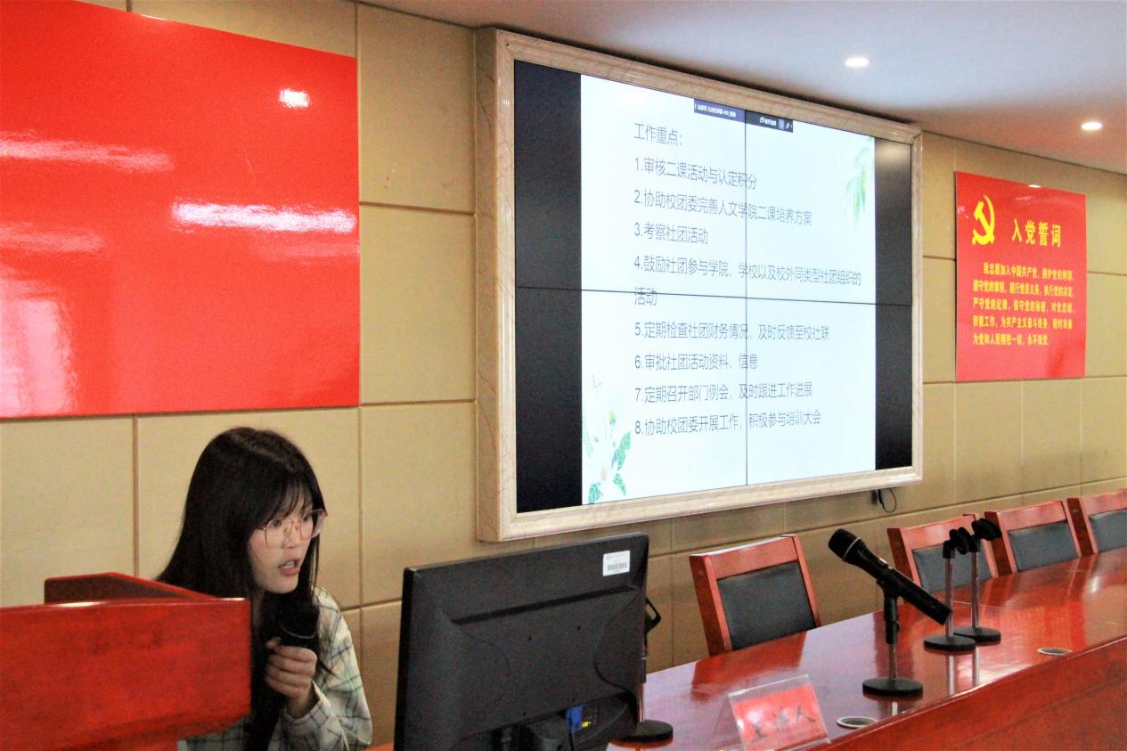 会上,各部门按照顺序依次上台进行汇报。参与述职的18名部长简要介绍了部门主要职能,展示了部门具体工作内容、取得的成绩和存在的问题,并就今后工作的开展方向做了规划,各班学生代表和与会老师根据部长的汇报情况对各部门进行打分考评。