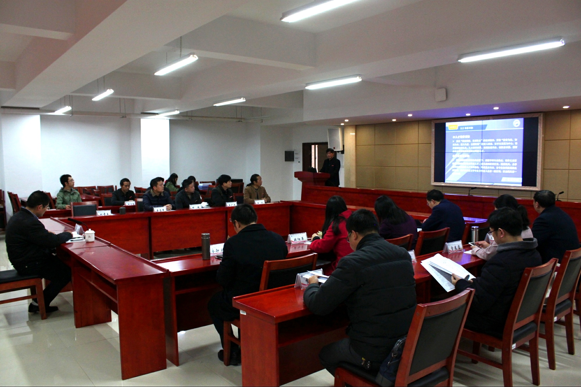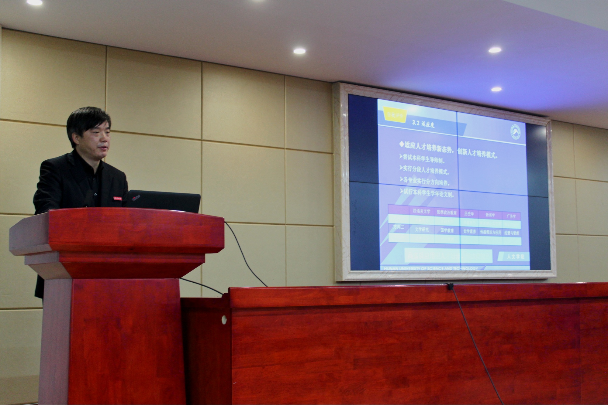 上午9时许,现场考察转移到立言楼B4-1报告厅,院长刘奇玉教授主持会议并做简要的汇报,院领导、相关系部负责人和教师代表近20人出席会议。刘院长首先简要阐述了ML米兰体育·(国际)官方网站的办学历程以及办学现状,学院的师资队伍以及定位与目标,他指出我院的办学类型是教学研究型,办学层次是本科教育为主,发展目标是特色鲜明的高水平教学研究型学院。3211工程、豆沙包工作室、黑蚂蚁传媒工作室、语言艺术团、隐山哲学社等学院优秀项目是学院坚持“守正创新”办学宗旨的重要体现。