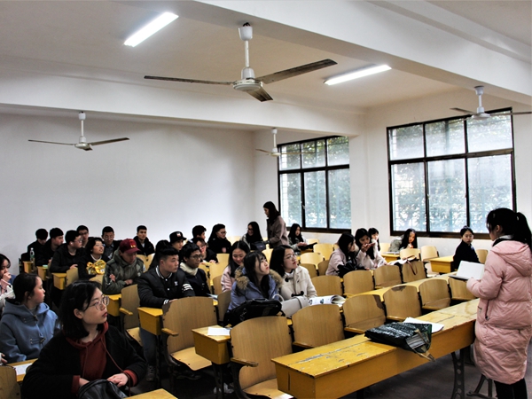 “各班自主设计的班级刊物应体现出专业特色,打造出各班级的个性亮点,同时有效弘扬正能量,展现当代大学生青春向上的风采风貌”。邬敏说道,她详细介绍了班刊设计与大赛的具体流程,主题和活动安排等。同时,宣传部人员发放了往届优秀的班刊作品以供各班作参考。随后,16级新闻一班黄姗姗作为往届优秀班刊制作者受邀上台介绍班刊制作经验。“我们班班刊起名为《问》,谐音‘新闻’的‘闻’。”黄姗姗首先介绍了班刊名的选定,随后,她从目录的制作及内容的选择等方面分享了班刊的制作过程。她建议,各班在制作班刊时的排版要尽量简洁明了,字数与页数可根据各班特色决定,尽量将班刊电子版导出为PDF格式,再拷贝到U盘中,以便于决赛展示。