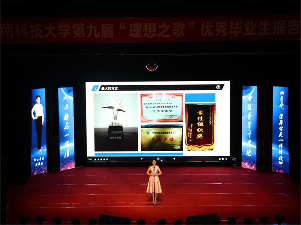 6月10日晚,第九届“理想之歌”优秀毕业生报告会在俱乐部隆重召开。十位报告人在此追忆青春过往,共诉锦瑟年华。本次报告会由校招生就业处主办,ML米兰体育·(国际)官方网站承办。我校副校长胡石其、相关职能部门和各学院领导出席本次报告会,还有来自各学院的上千名学生到场聆听。