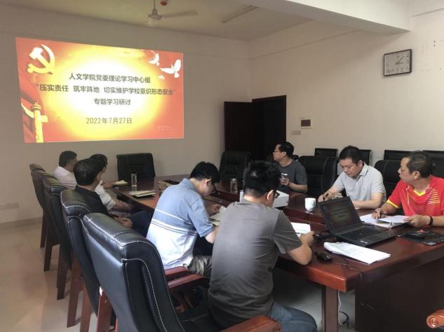 2022年7月27日,ML米兰体育·(国际)官方网站学院党委理论学习中心组在立言楼B505室开展“压实责任 筑牢阵地 切实维护学校意识形态安全”专题集中学习,集中学习由曾志东书记主持,全体党委委员和党政办负责同志参加了本次集中学习。