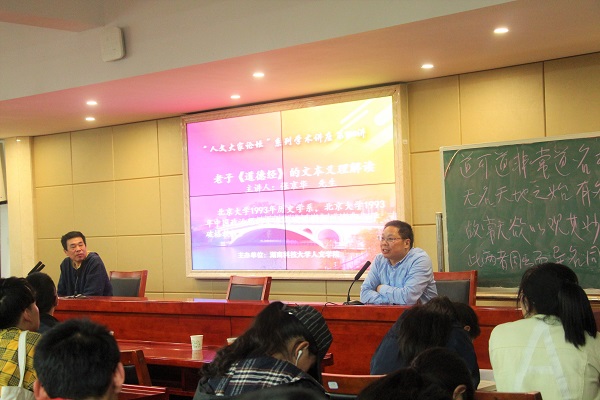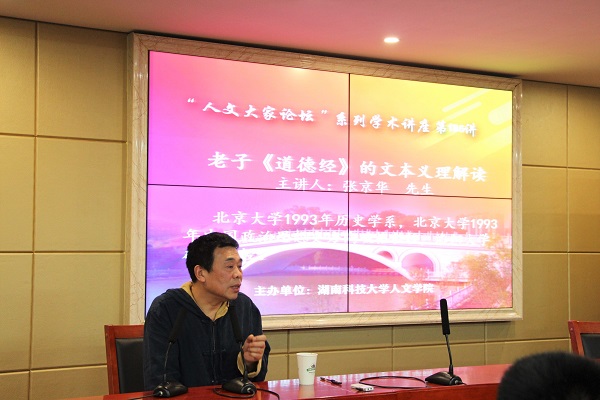 4月17日晚,湖南科技学院张京华教授应邀前来我校ML米兰体育·(国际)官方网站做了一堂题为“老子《道德经》的文本义理解读”的精彩学术报告。本次讲座由我院党委书记廖加林教授主持,我院吴广平教授、王友胜教授、张晚林教授、颜中军、胡忆红、余霞、胡红梅、龚超等老师及文、史、哲等专业的100多为本科生、硕士研究生到场聆听。