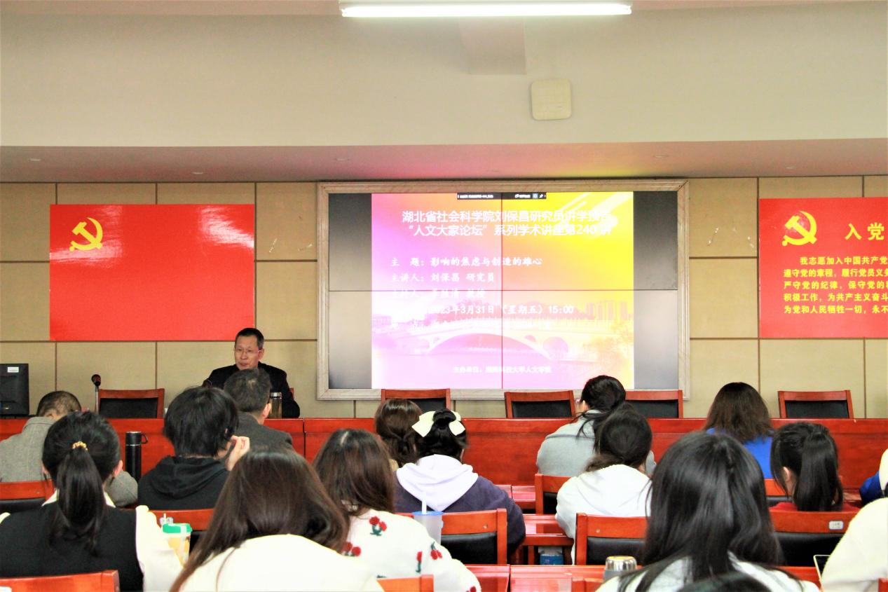 3月31日下午,由ML米兰体育·(国际)官方网站ML米兰体育·(国际)官方网站主办的“人文大家论坛”第240讲于立言楼B4-1室举行。湖北省社会科学院二级研究员刘保昌先生应邀为我院师生做题为“影响的焦虑与创造的雄心”的学术讲座。本次讲座由李胜清教授主持,刘郁琪、胡志明、梁小娟、邓桂英等老师以及汉语言文学专业研究生和本科生到场聆听。