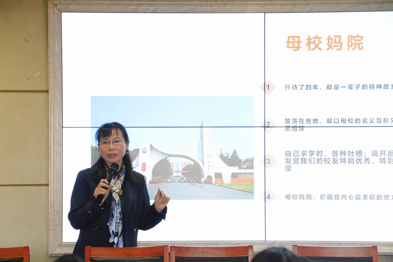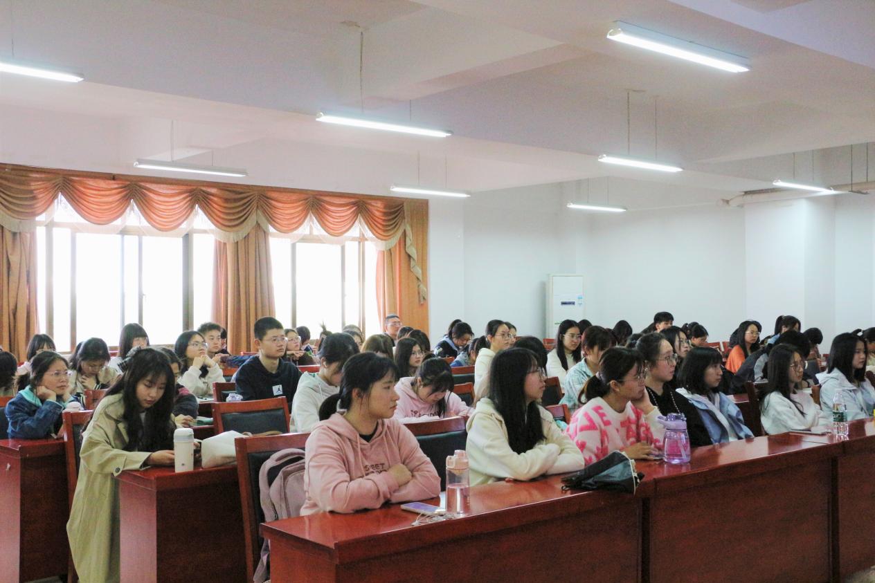 “学生应做好实习和考研计划,学会利用老师或校友资源,主动积极寻求实习机会。”针对考编现状,她指出,如今师范类院校分数线不断升高,考编难度也不断加大,学生要在面试前做好充分的准备。“凡有行动,必有凭借。凡有作为,必有地位。”她用学者刻苦研究《红楼梦》并凭此出版书籍的事例提醒学生要在某一方面深入钻研,并能有所建树。谈及诗歌教学研究,她以徐志摩的《再别康桥》为例子,向同学们详细讲解了不同押韵类型,并解释这些押韵类型在作者情感变化方面的作用,以此引申到语法、语义的变异,诗歌层次及新诗歌写作教学。