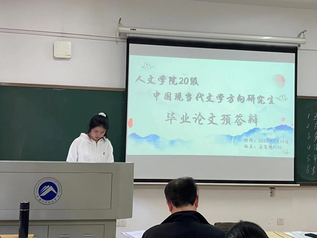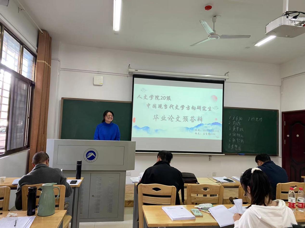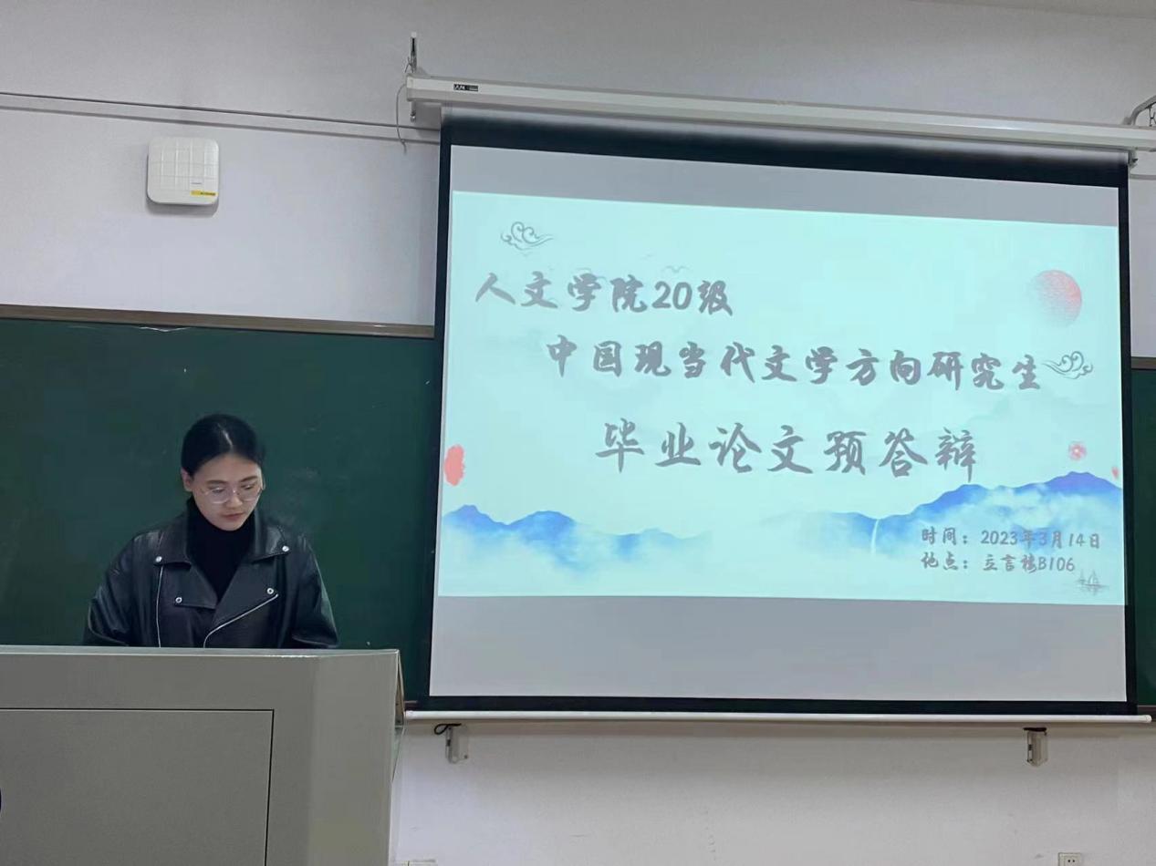 2023年3月14日,我院2020级中国现当代文学方向研究生毕业论文预答辩在立言楼B106顺利举行。此次预答辩由方向负责人刘郁琪教授主持,彭在钦教授、袁星洁教授、吴投文教授、刘郁琪教授、梁小娟副教授担任此次预答辩的评委。20级现当代文学方向的田思琦、项膑之、肖睿壑、李慧娟、王禾阳、龚梦姣和熊杜娟7位同学参与预答辩。