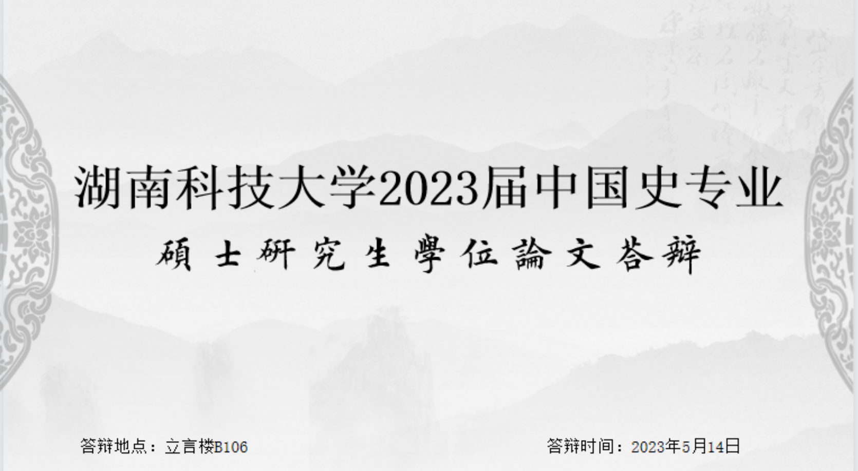 5月14日,ML米兰体育·(国际)官方网站2020级中国史专业硕士研究生学位论文答辩于立言楼B106如期举行。本次答辩邀请湘潭大学章育良教授担任答辩主席,湘潭大学吉成名教授以及我院徐红教授、金身佳教授、周方高教授、聂志军教授担任答辩委员。2020级中国古代史方向8位硕士研究生参与此次答辩。