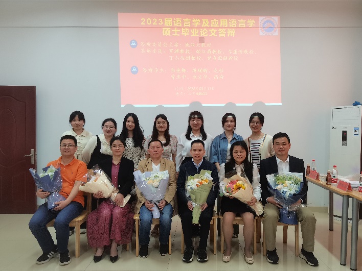 图为答辩委员会与2023届语言学及应用语言学方向硕士研究生合影